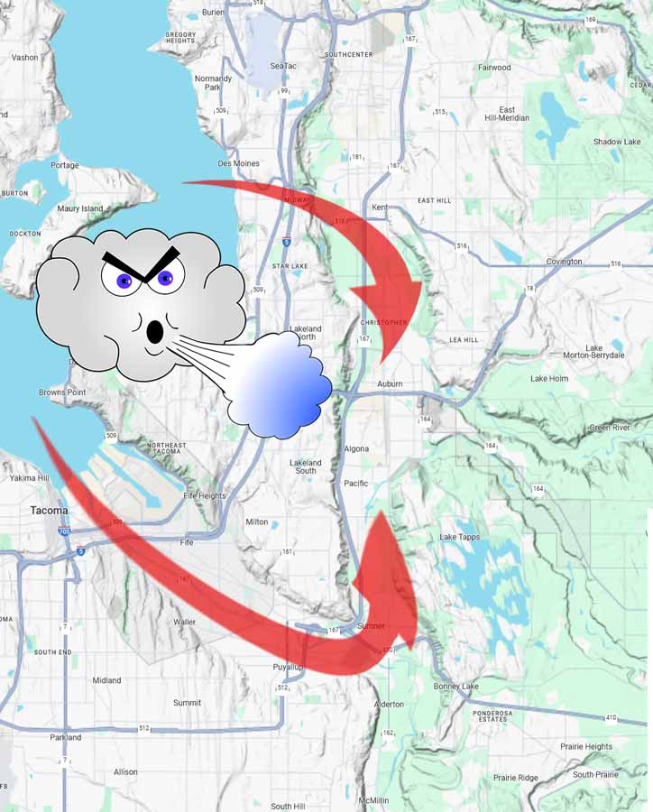 Most long time Auburn residents have become familiar with the “wind tunnel effect” that directs storms from Puget Sound into our valley. The way Auburn is located, we are at a ‘cross roads’ of two different air streams from the north and south.
